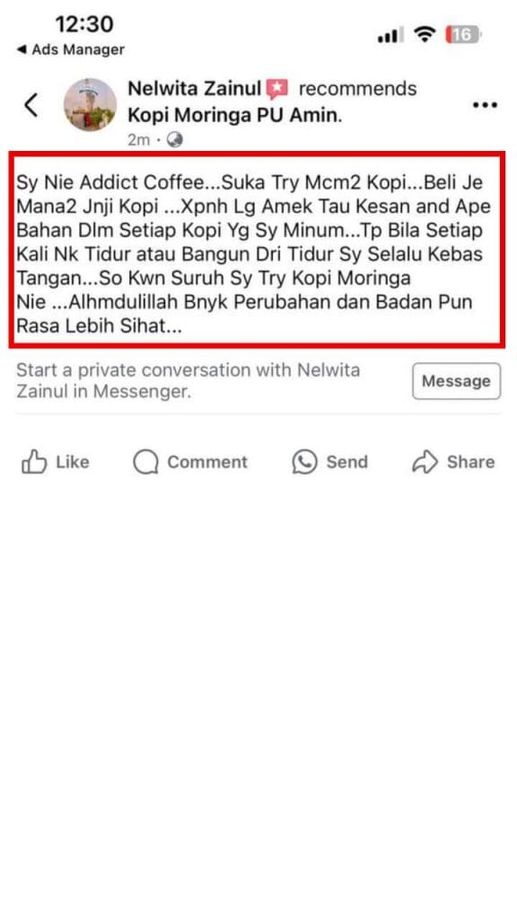 Lihat testimoni dan review daripada pengguna setia KOPI MORINGA NISKA yang wajib repeat order setiap bulan
